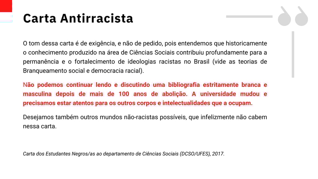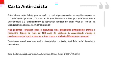 A primeira edição do curso ocorreu em 2019, na Universidade Federal do Espírito Santo, campus de Vitória, e foi idealizada em apoio à Carta Antirracista de Estudantes Negros/as de Ciências Sociais. O curso foi criado e oferecido durante o período de vigência do meu contrato de professor substituto na UFES. Trata-se do primeiro curso exclusivamente baseado na vida e na obra de antropólogos negros e negras na história das Ciências Sociais no Brasil.